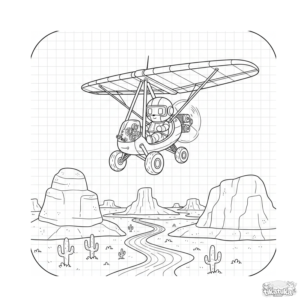Стильная раскраска сверхлегкого самолета в техническом чертежном стиле, летящего над пустыней. Для детей 10-12 лет. Необычный дизайн, интересный для раскрашивания.