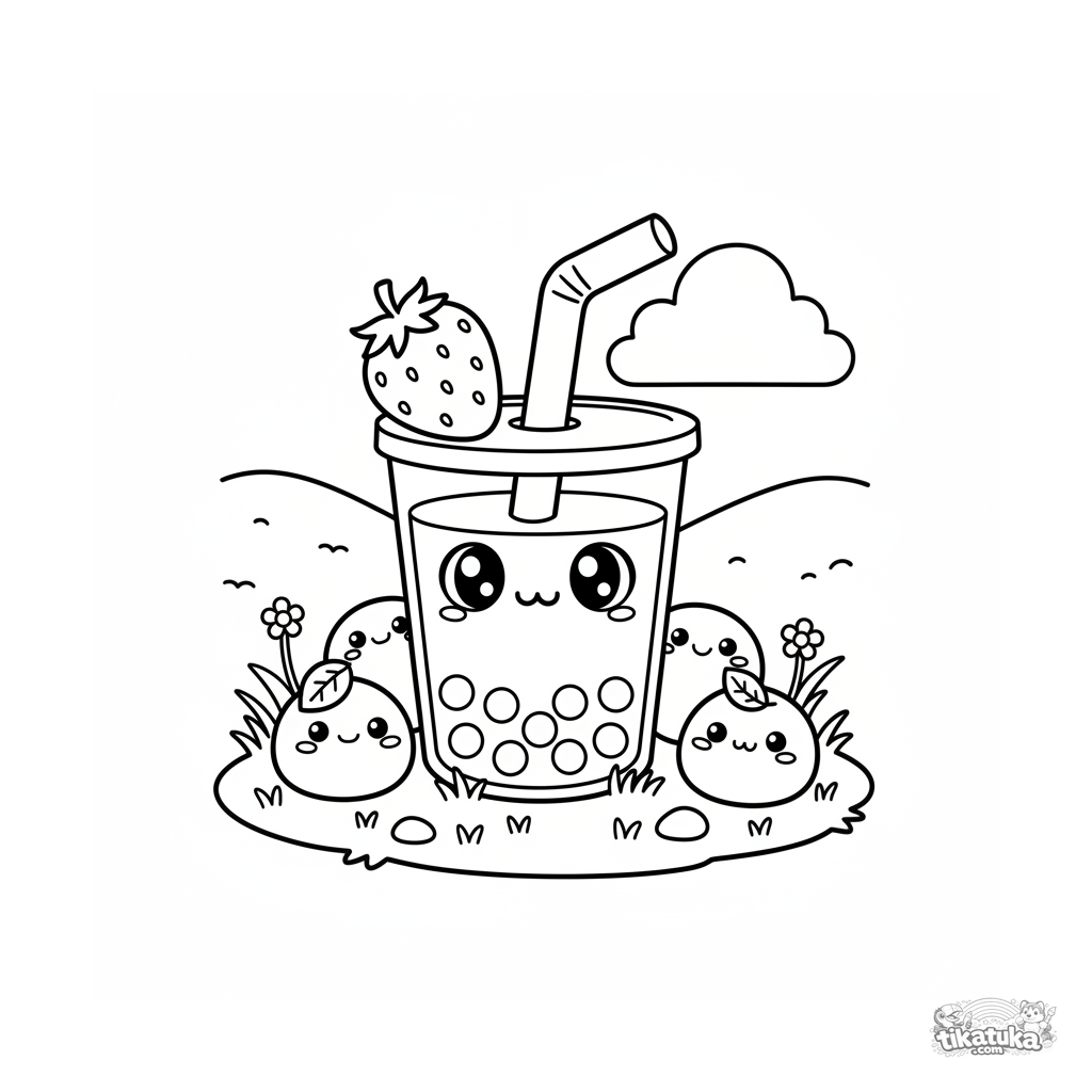 Раскраска для детей 4-6 лет: чашка боба играет в прятки за большим клубничным моти. Весёлая сцена с деталями.