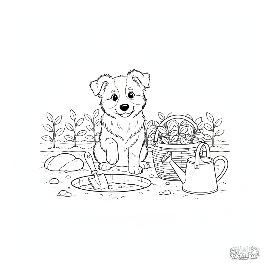Раскраска для детей: пушистый щенок колли помогает в весеннем саду, сидит рядом с лункой и садовым инвентарём. Чёткие контуры, милая сцена.