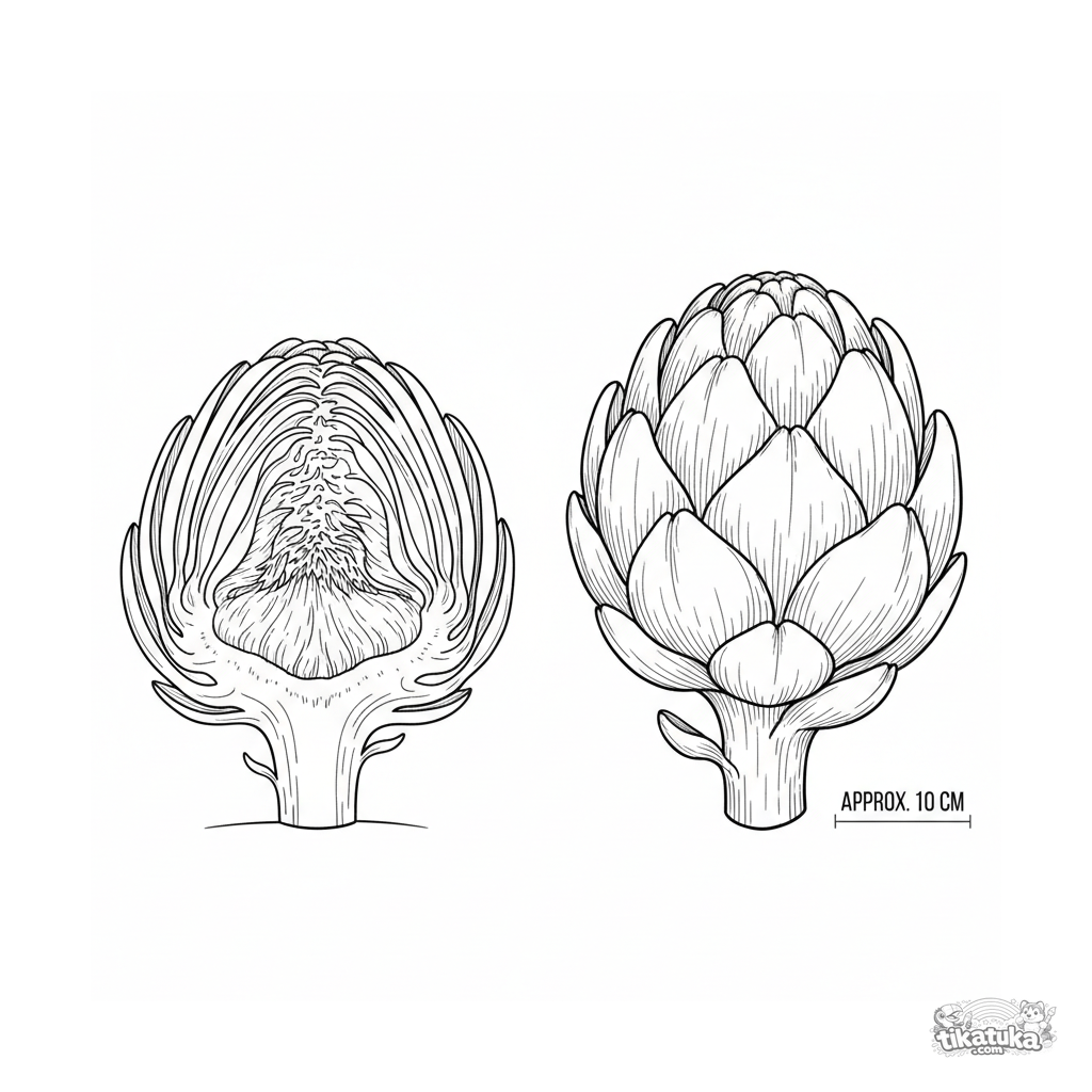 Раскраска для детей 10-12 лет: детальный ботанический разрез артишока в научном стиле. Образовательная иллюстрация с чистыми линиями.