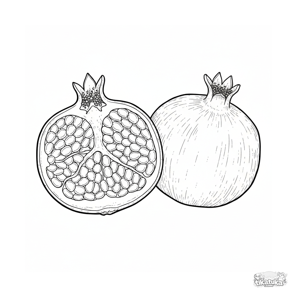 Детальная ботаническая раскраска разреза граната для детей 10-12 лет. Показаны камеры с семенами и чашелистики, стиль научного атласа.