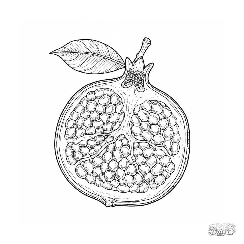 Обучающая раскраска для детей 10-12 лет: детальный ботанический разрез граната, показывающий структуру плода. Чистый фон.