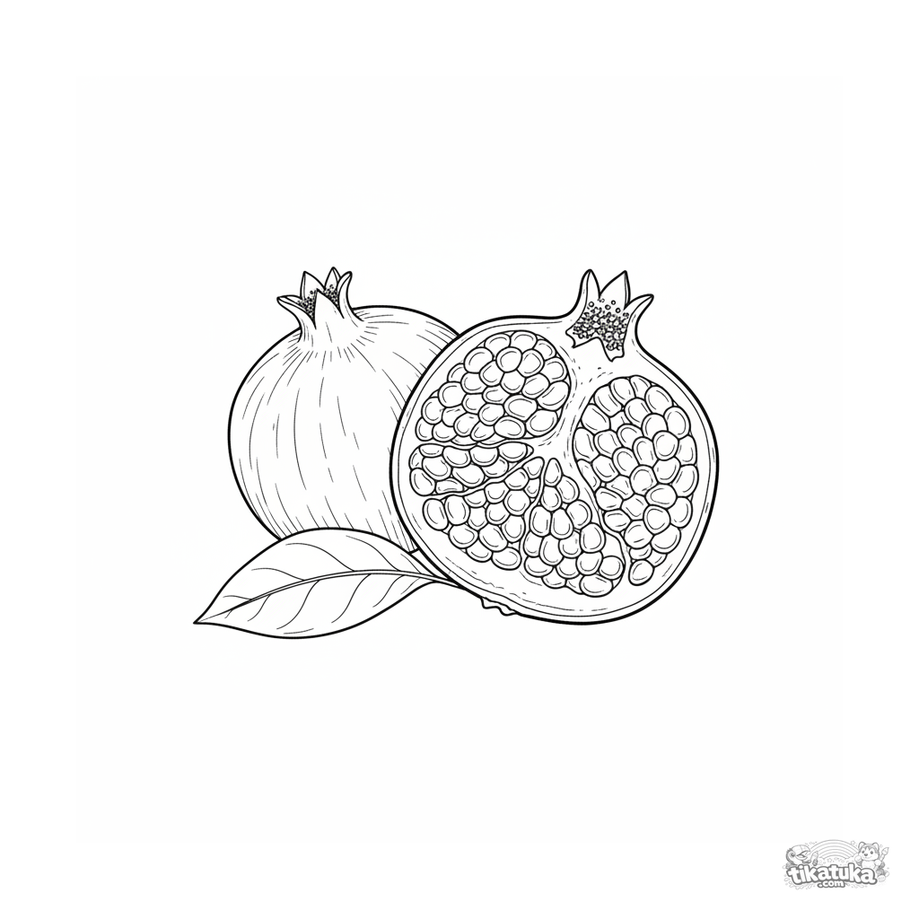 Образовательная раскраска для детей 10-12 лет: детальный ботанический рисунок граната в разрезе, показывающий семена. Стиль полевого определителя, чистый фон.