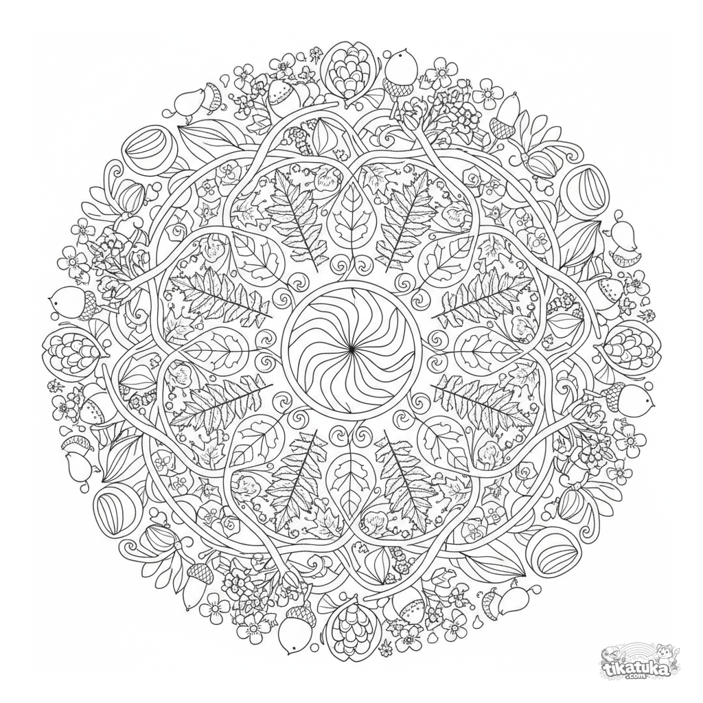 Сложная ботаническая мандала-раскраска для детей 10-12 лет. В центре спираль папоротника, окружённая кольцами из листьев, виноградных лоз, шишек и желудей.