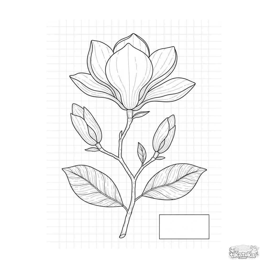 Детальная раскраска для детей 10-12 лет: ветка магнолии как ботанический прессованный образец. Точные линии, текстуры, образовательный стиль.