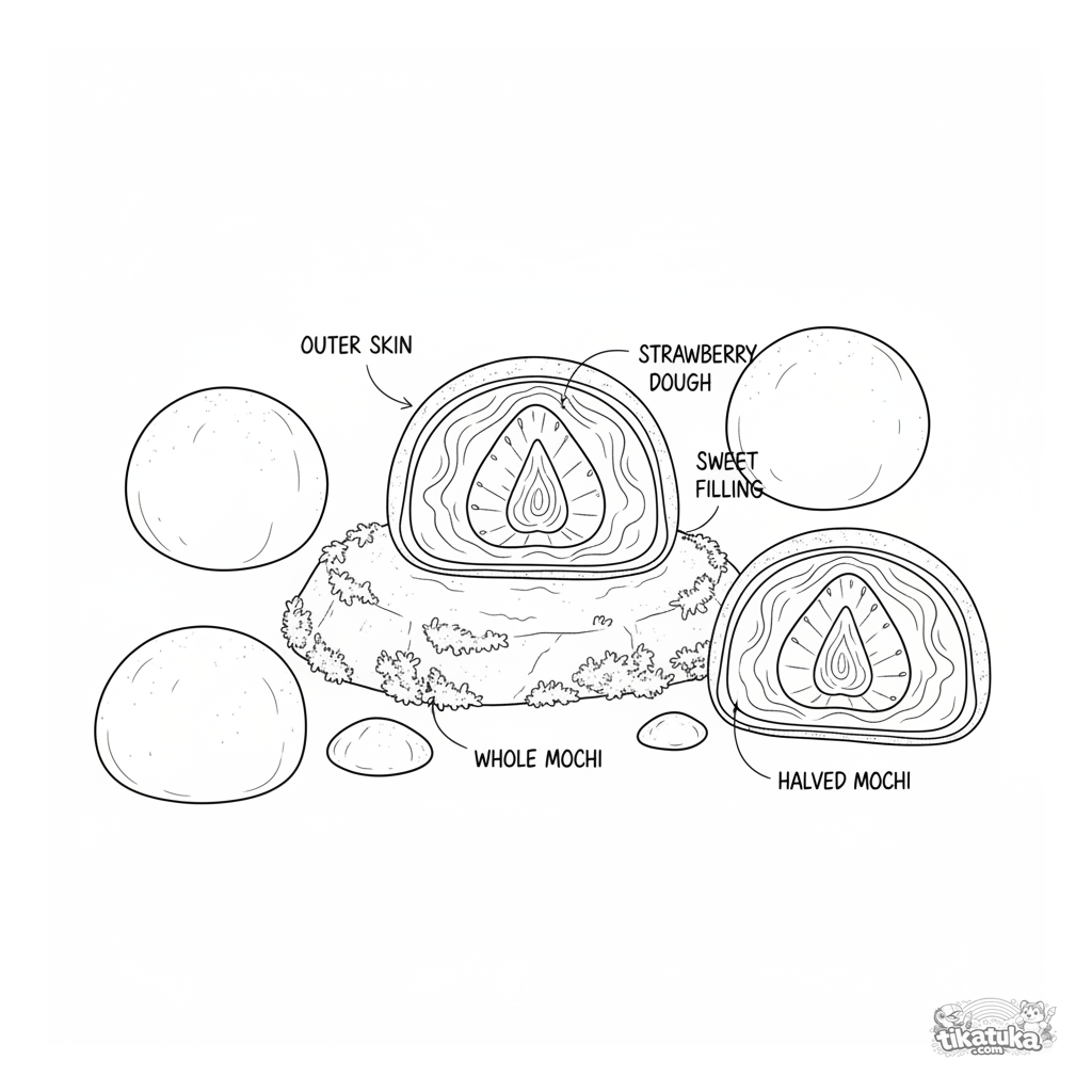 Сложная раскраска в научном стиле для детей 10-12 лет: детальный ботанический этюд клубничного моти в разрезе, с подписями. Высокий уровень детализации.