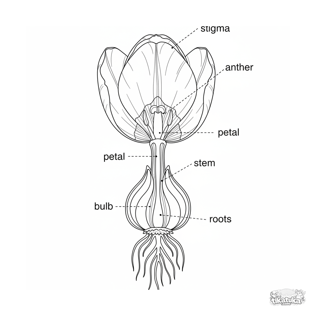 Обучающая раскраска для детей 10-12 лет: детальный ботанический рисунок тюльпана в разресе с подписями частей цветка. Стиль научного атласа.