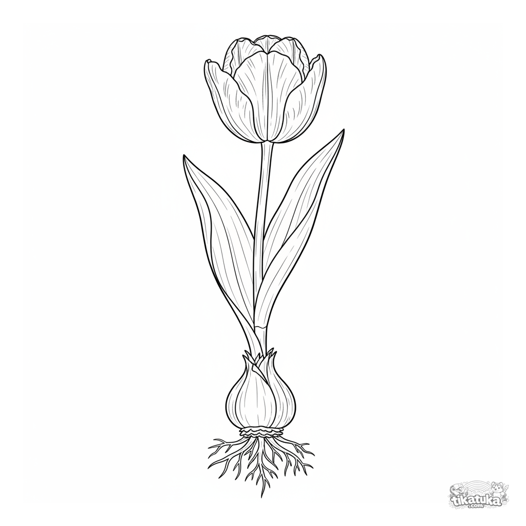 Раскраска для детей 10-12 лет: детальный ботанический рисунок тюльпана в разрезе, показывающий цветок, стебель, листья, луковицу и корни.