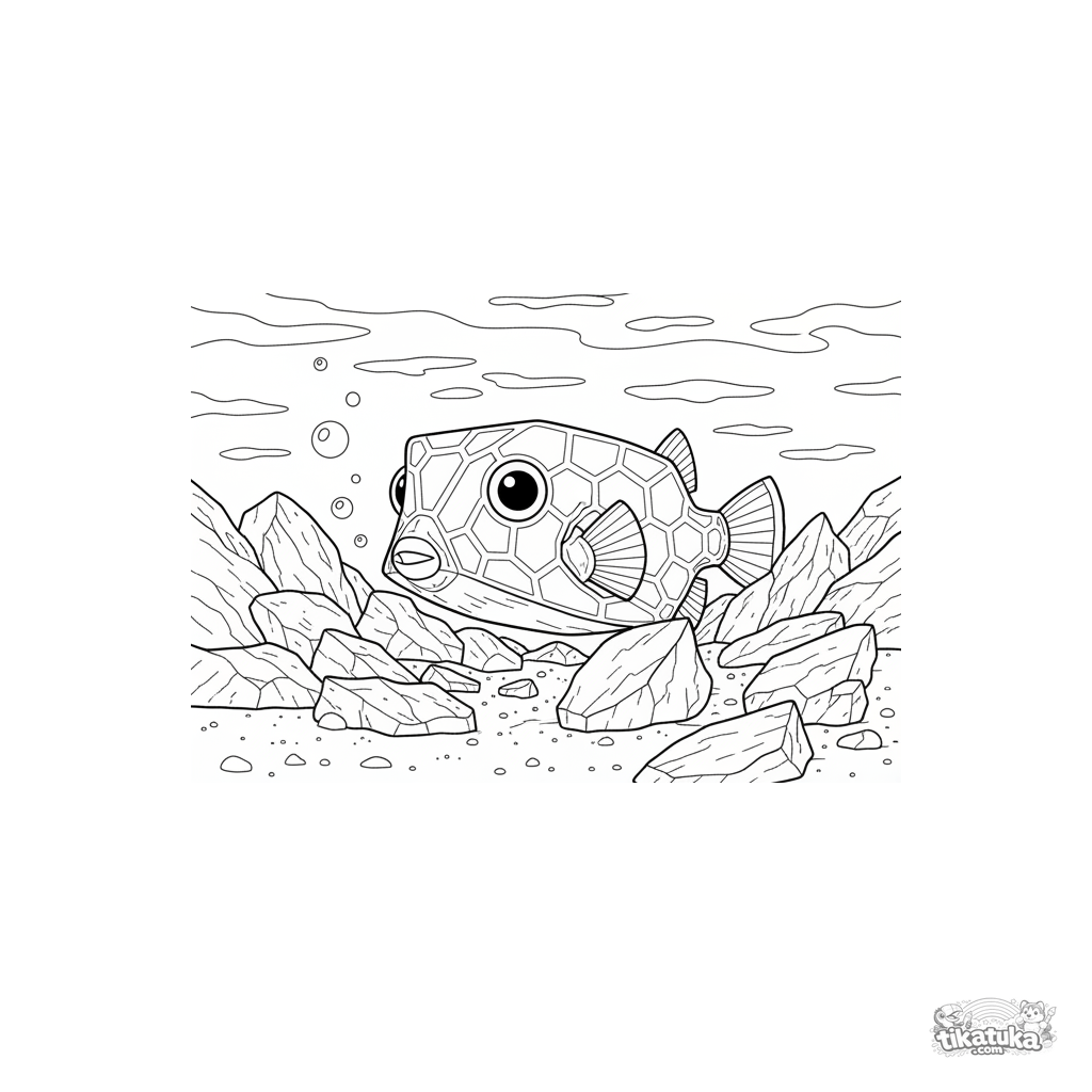 Детализированная раскраска кузовка, прячущегося среди обломков кораллов на мелководье в солнечных лучах. Для детей 10-12 лет. Чёткие контуры, естественные пропорции.