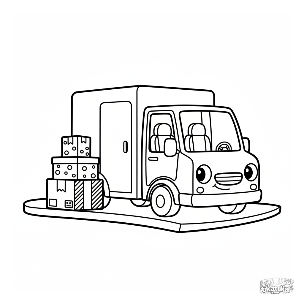 Раскраска для малышей 2-3 лет. Простой квадратный грузовик доставки с посылками стоит у тротуара. Крупные чёткие формы, идеально для первых раскрасок мальчиков.