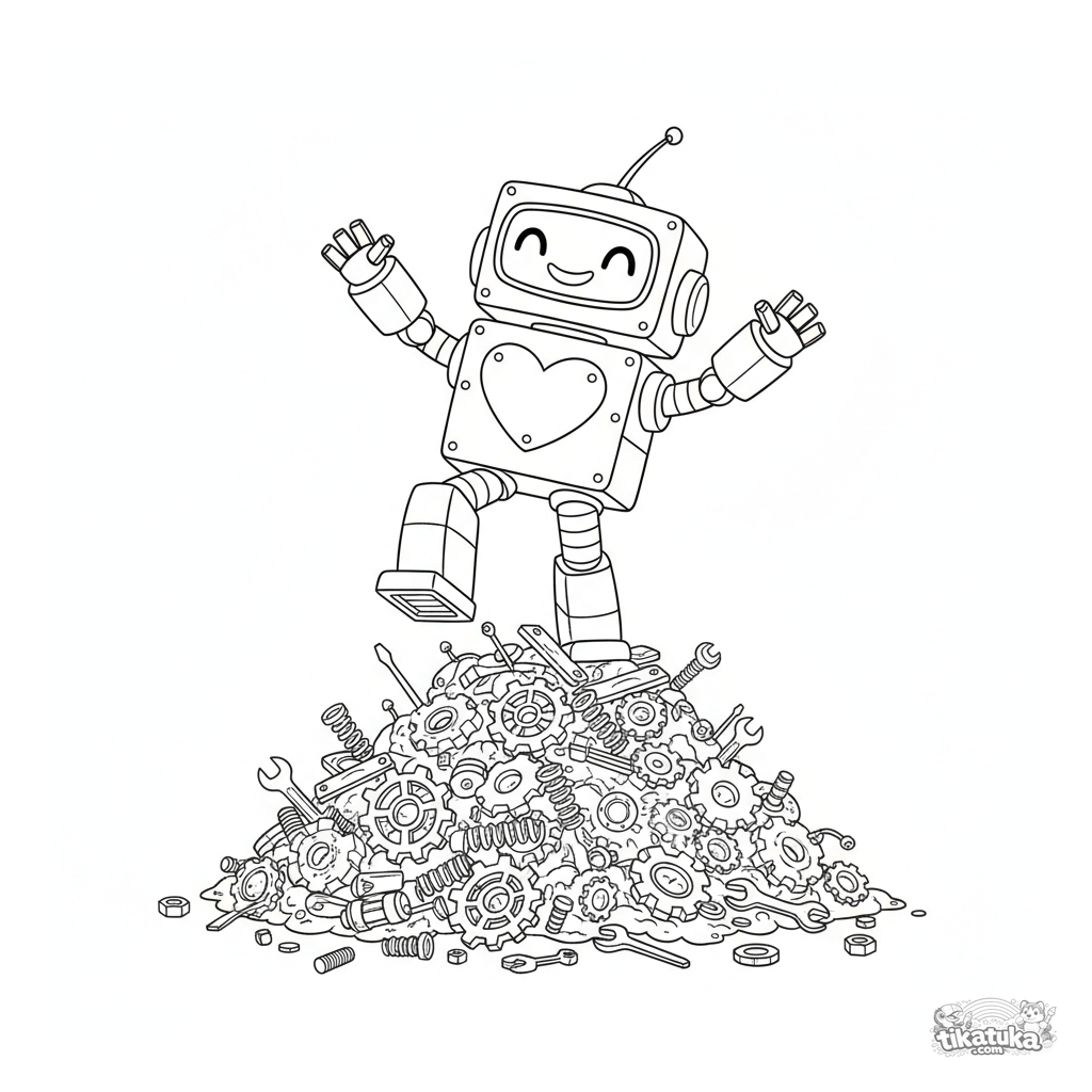 Раскраска для детей 7-12 лет: дружелюбный квадратный робот с панелью в виде сердца машет руками, стоя на куче запчастей. Высокая детализация, много мелких элементов.