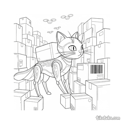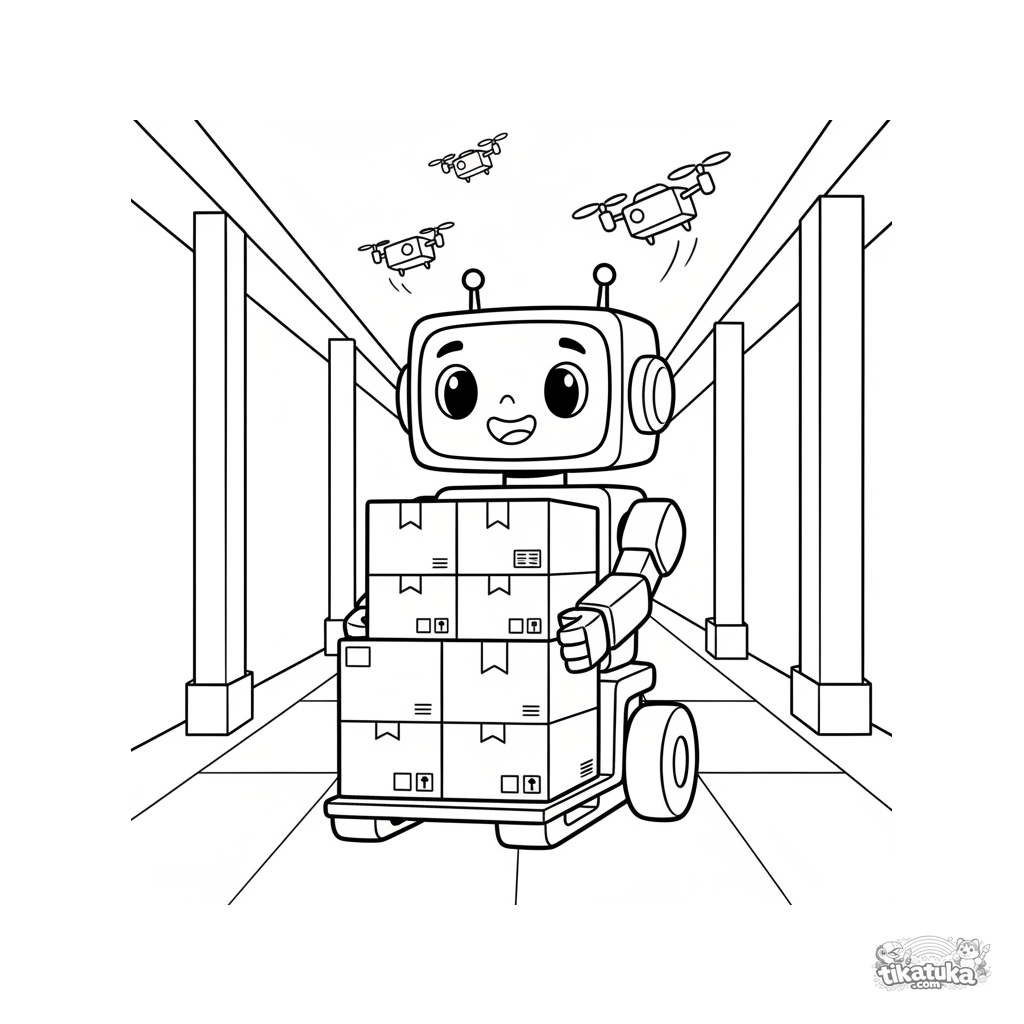 Раскраска с коробчатым роботом-рохлей, везущим стопку коробок по складу. Для детей 4-6 лет. Четкие геометрические формы и дружелюбное выражение.
