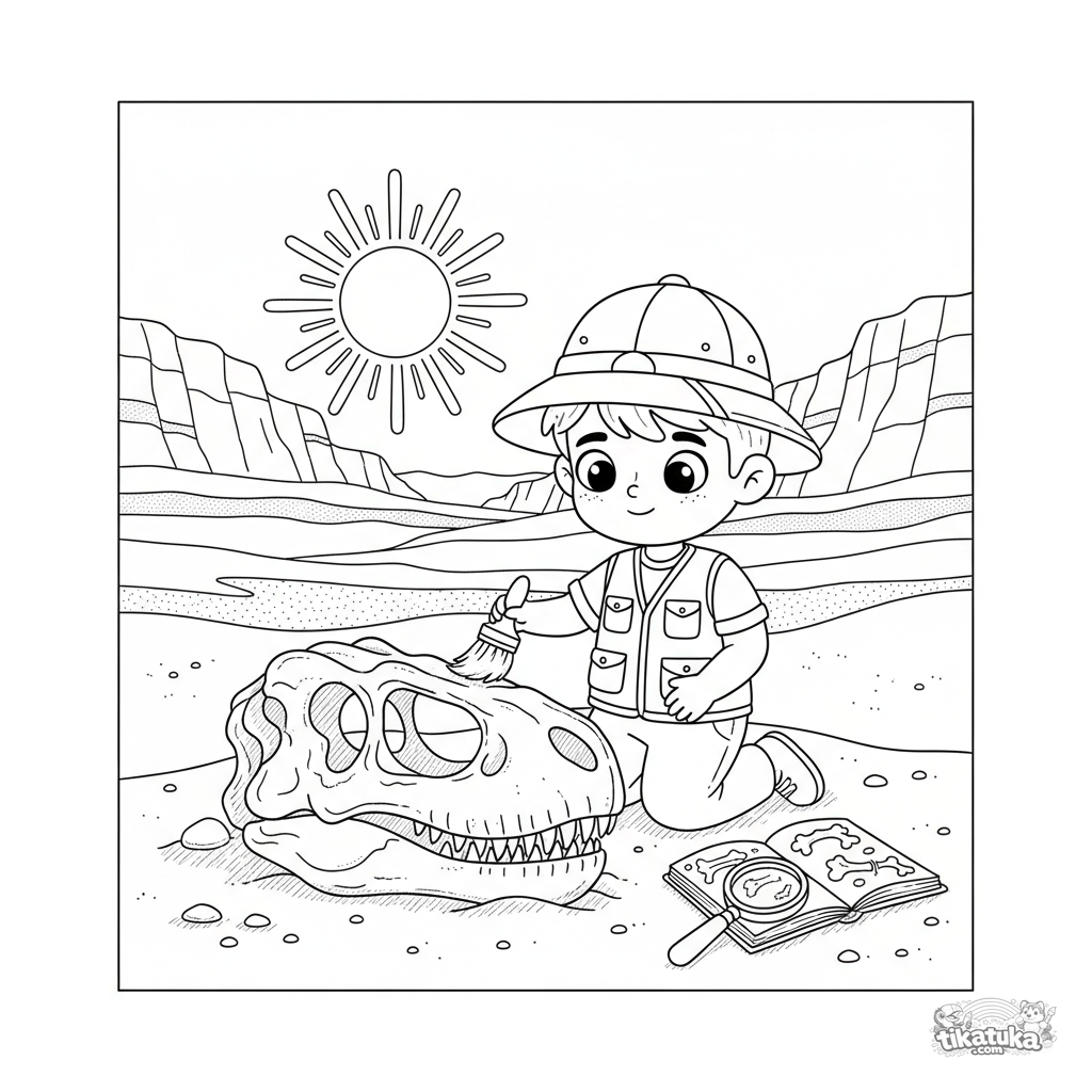 Раскраска с мальчиком-археологом, который осторожно очищает окаменелость динозавра в пустыне. Для детей 6-9 лет. Интересные детали для раскрашивания.
