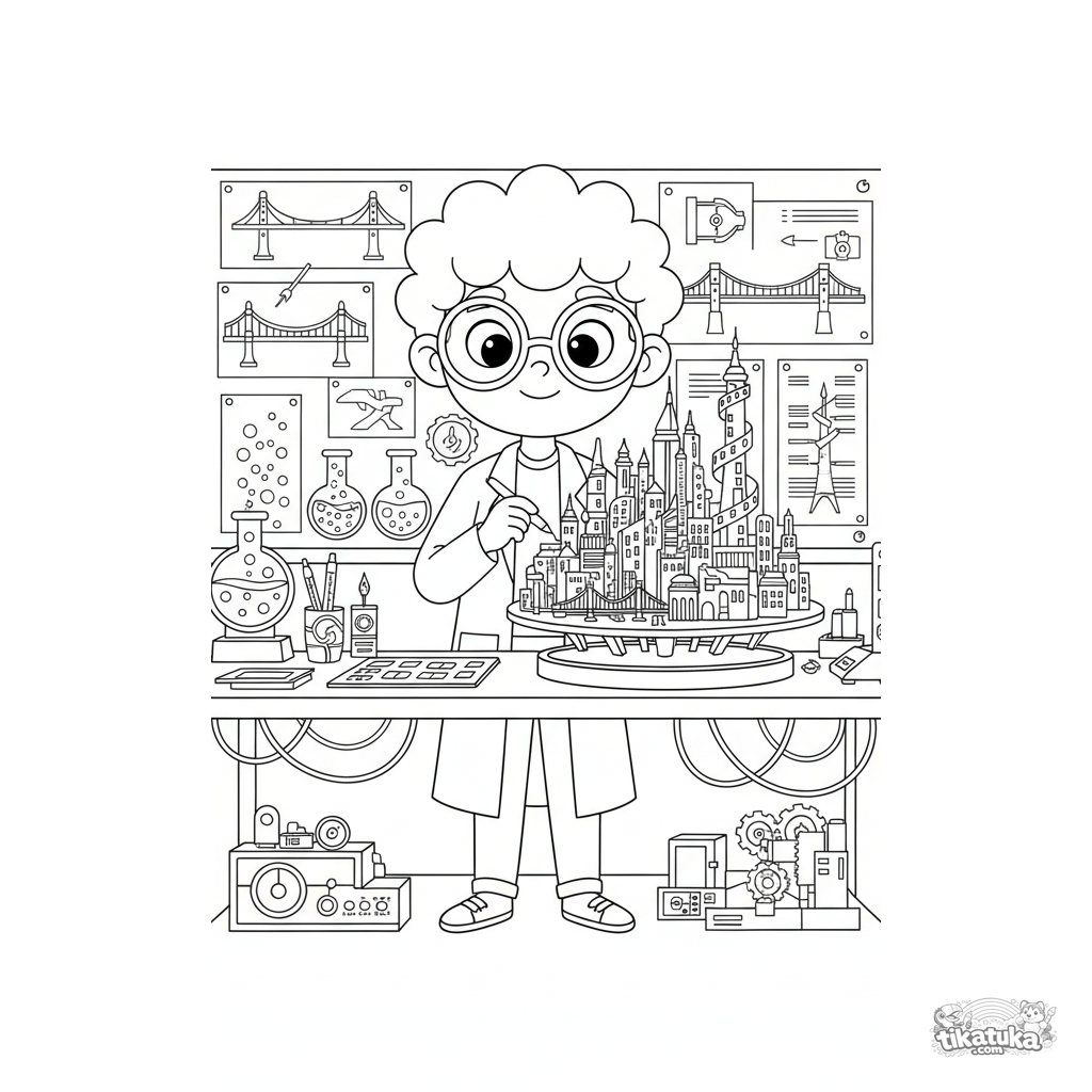 Раскраска для детей 10-12 лет: мальчик-архитектор в секретной лаборатории работает с парящей моделью футуристического города. Детальные чертежи и схемы на стене.