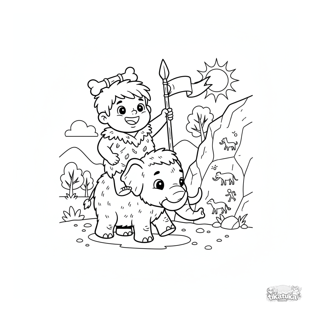 Раскраска для мальчиков: пещерный мальчик едет на мамонтёнке мимо наскального рисунка. Для детей 5-8 лет. Весёлое доисторическое приключение.