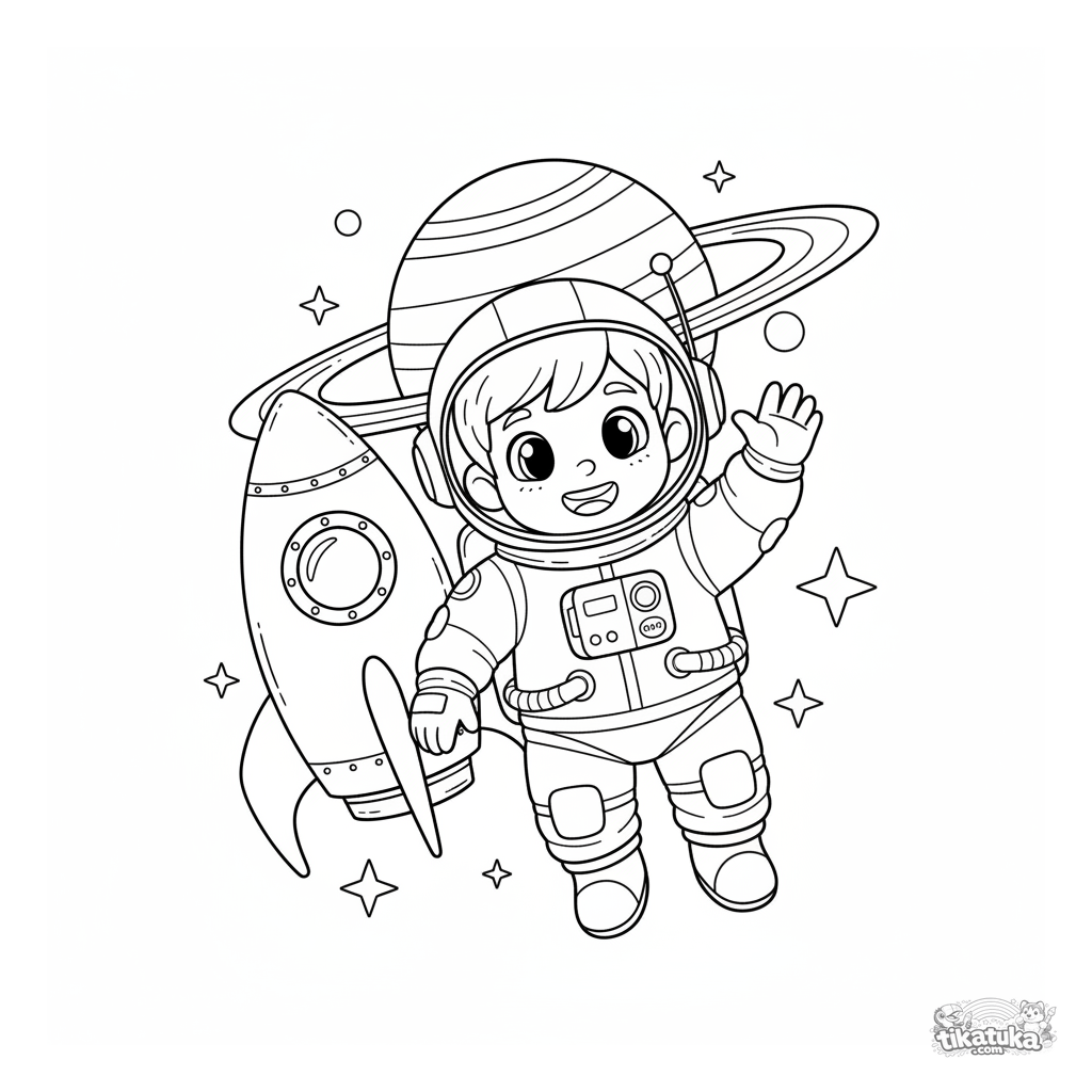 Раскраска для мальчиков: юный космонавт в скафандре парит рядом с ракетой на фоне планеты. Для детей 4-6 лет.