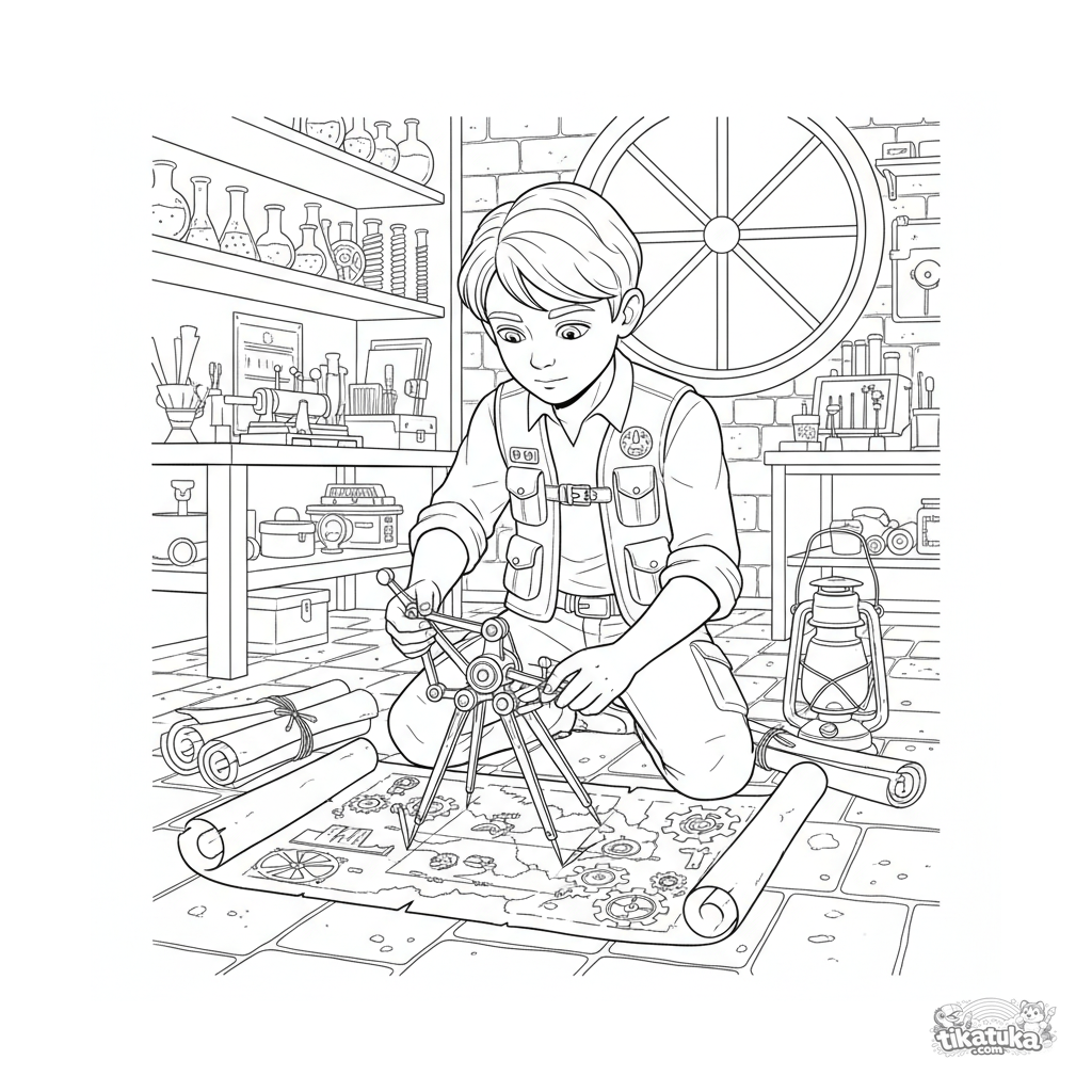 Детальная раскраска для детей 10-12 лет: мальчик-картограф в секретной лаборатории чертит карту с помощью сложного механического компаса. Реалистичный стиль.