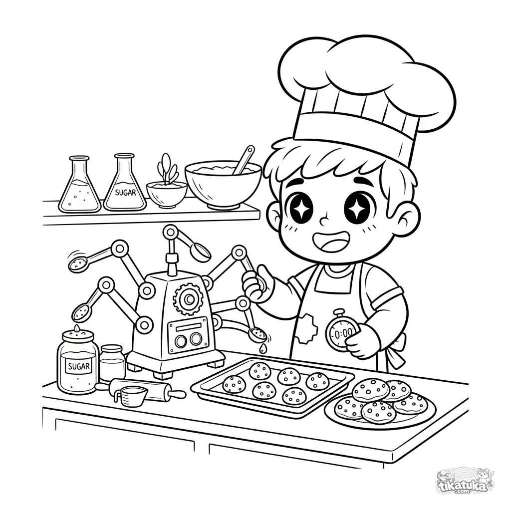 Раскраска для детей 4-6 лет: весёлый мальчик-повар в лаборатории тестирует своё изобретение — автоматическую машину для выпечки печенья. Яркая и понятная сцена.