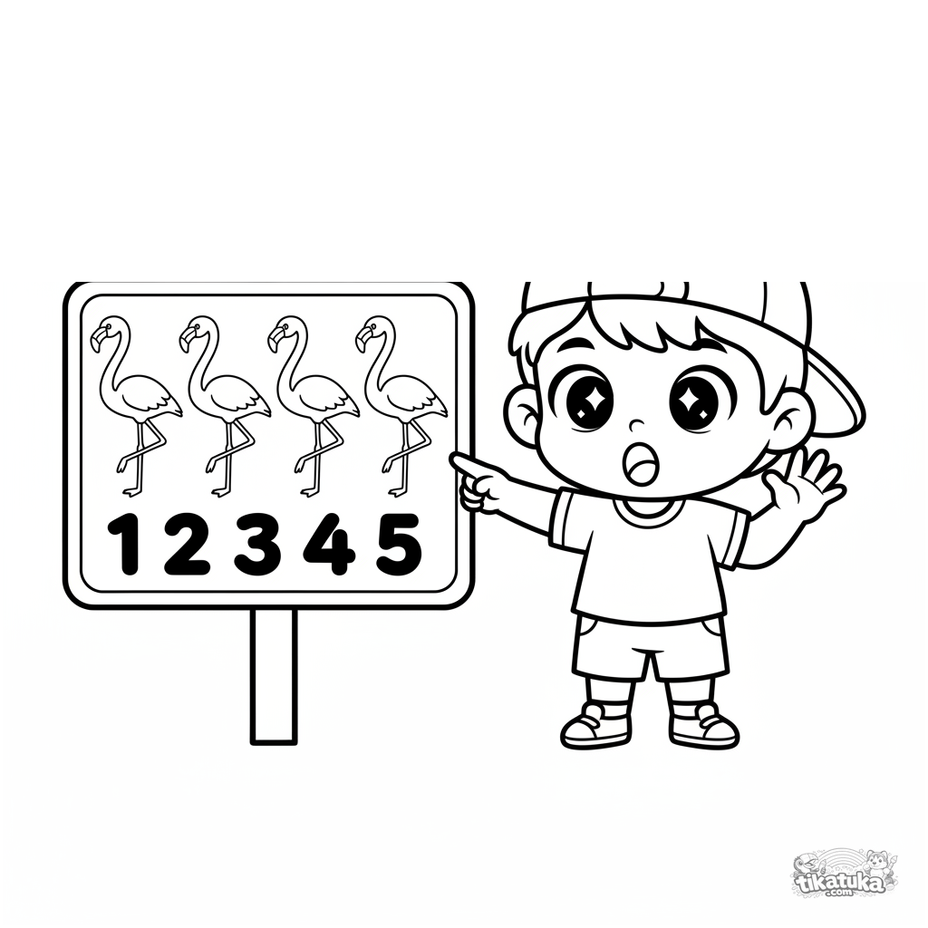 Раскраска для малышей 2-3 лет: мальчик считает фламинго на табличке в зоопарке. Большие простые формы, учим цифры.