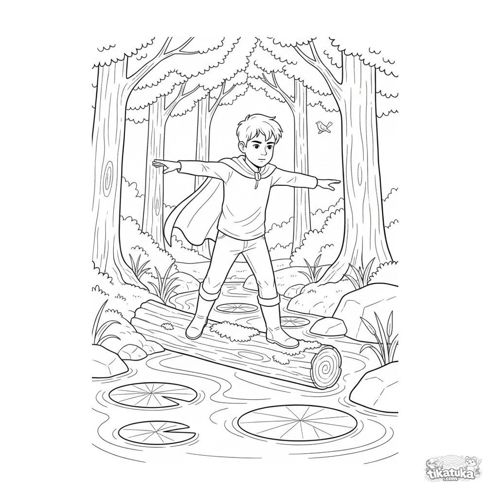 Раскраска для детей 4-6 лет: мальчик в плаще балансирует на скользком бревне над лесным ручьём. Реалистичный стиль с умеренной детализацией, понятные формы.
