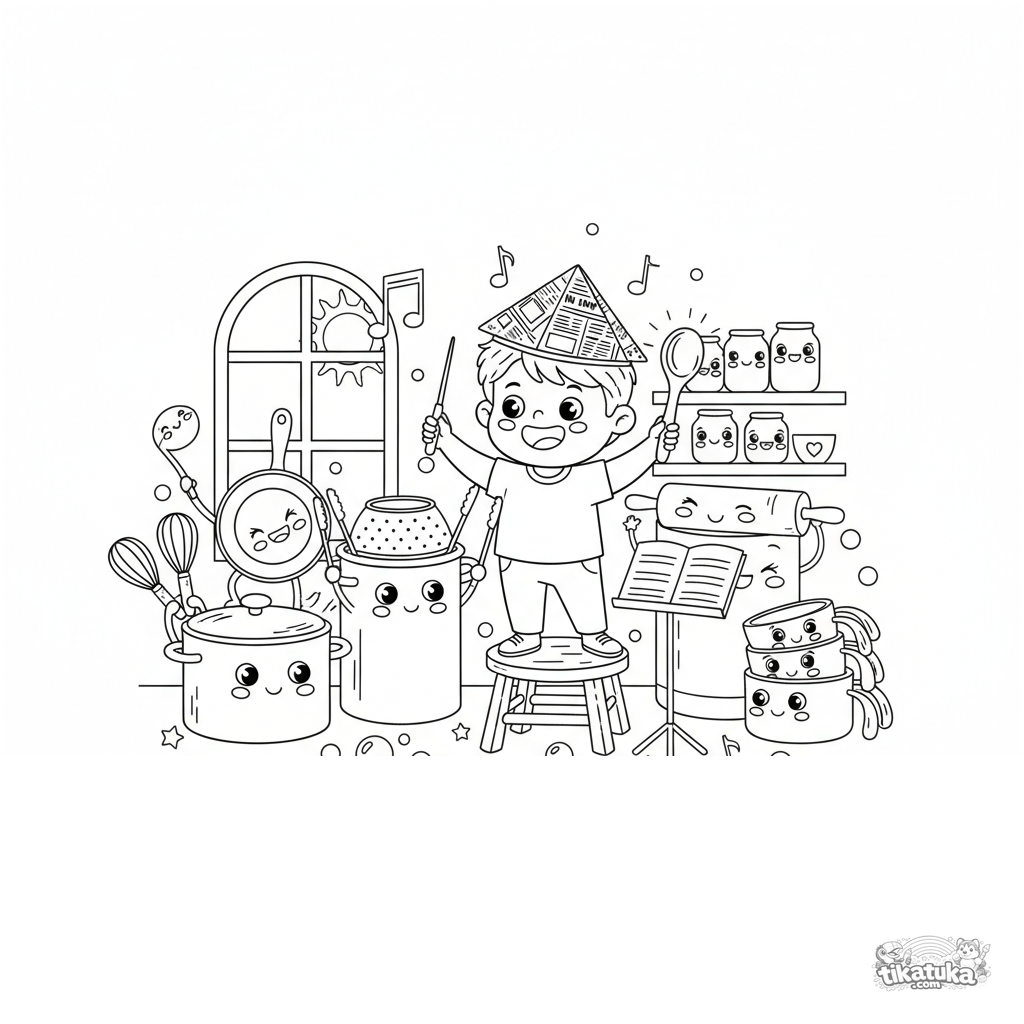 Раскраска с мальчиком в газетной шляпе, который дирижирует веселым оркестром из кастрюль и ложек на кухне. Для детей 5-8 лет. Сцена творческой игры и воображения.