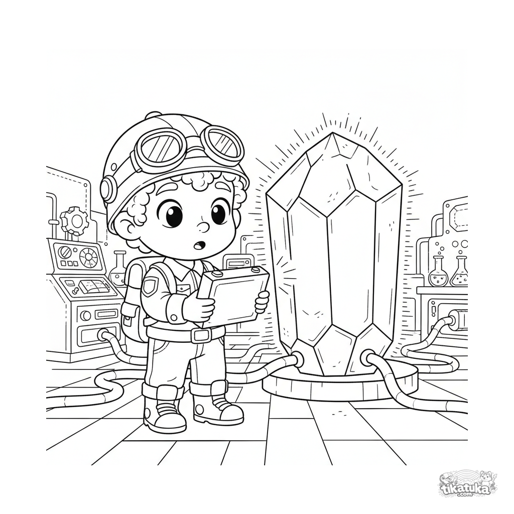 Раскраска для детей 7-9 лет: мальчик-исследователь в секретной лаборатории осторожно изучает гигантское пульсирующее кристаллическое энергоядро.
