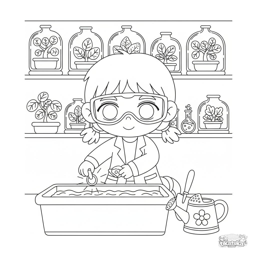 Раскраска для детей 4-6 лет: мальчик-изобретатель сажает светящееся семя в лабораторном саду. Теплая и спокойная сцена для раскрашивания.