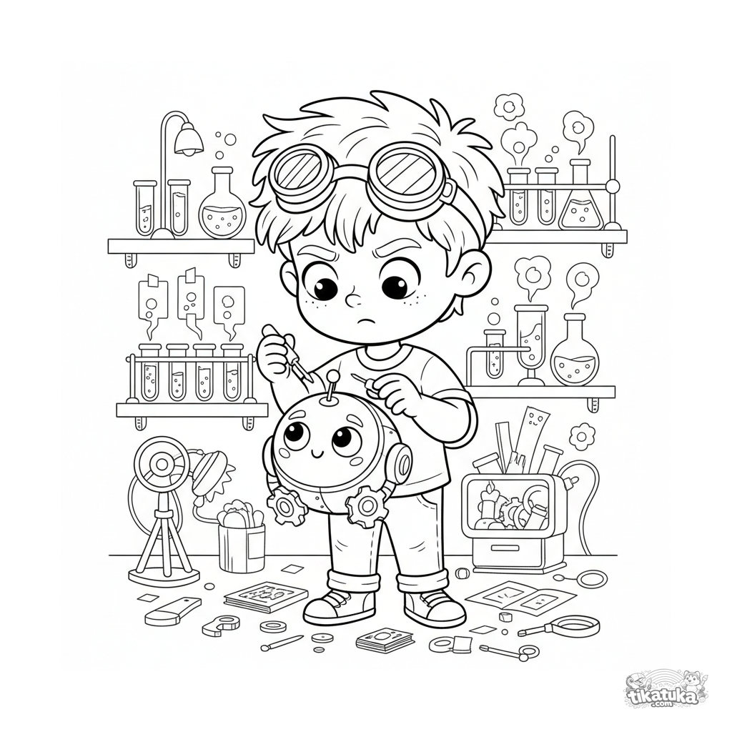 Раскраска для детей 4-6 лет: мальчик-изобретатель и его робот-компаньон из шестерёнок в секретной лаборатории. Много интересных деталей для раскрашивания.