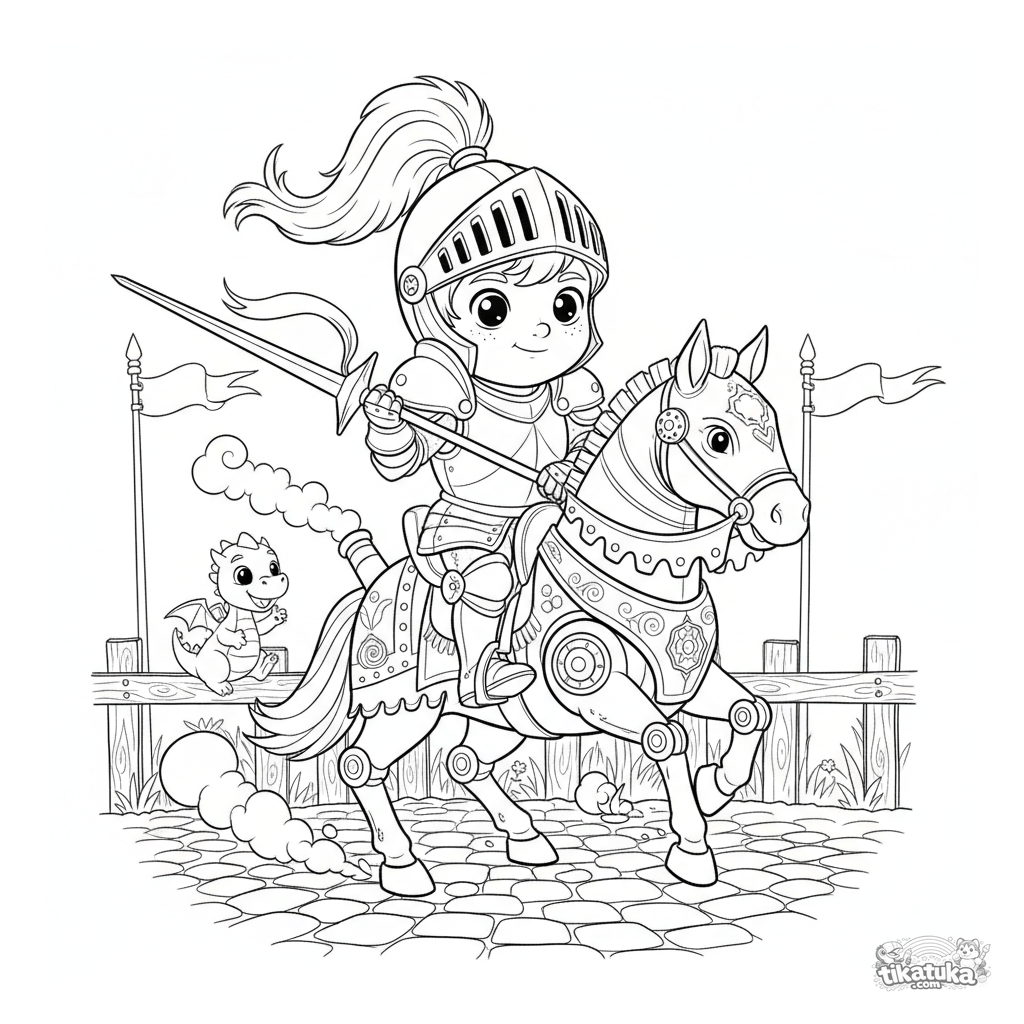 Сложная раскраска мальчика-рыцаря на механической лошади, участвующего в турнирном поединке. Для детей 8-12 лет. Много деталей: доспехи, шестеренки, дракончик.