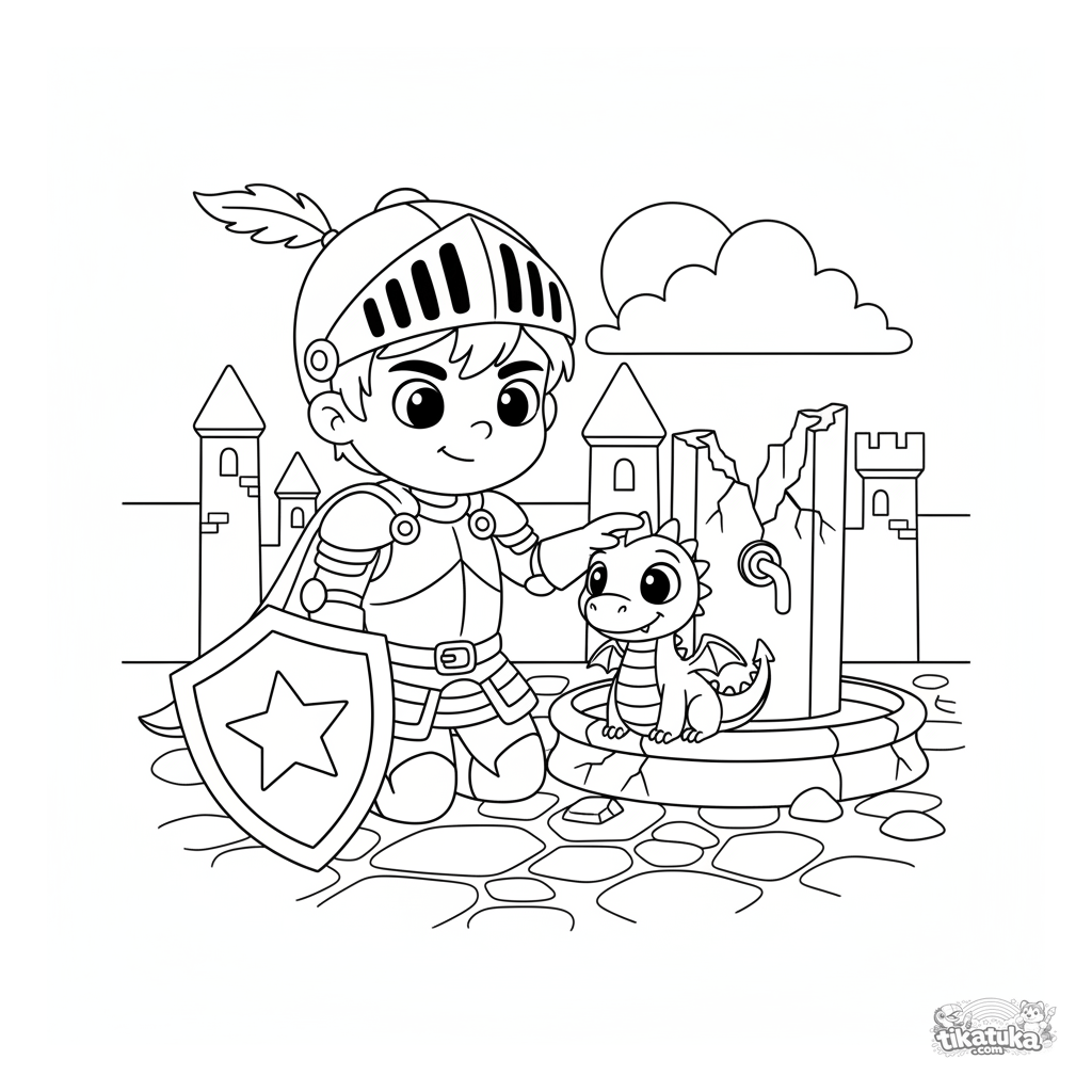 Раскраска для мальчиков 5-8 лет: юный рыцарь в каменном дворе ласково гладит детёныша дракона рядом с фонтаном.