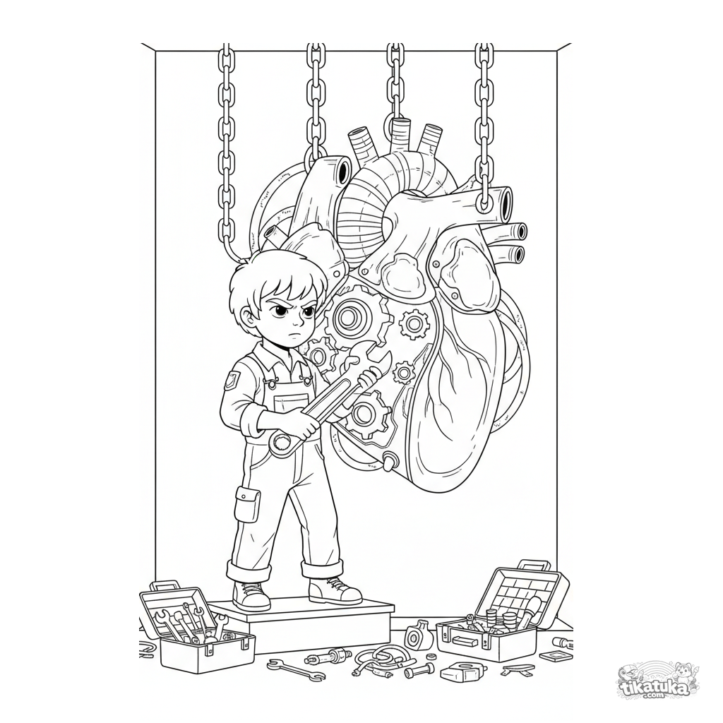 Детальная раскраска для детей 10-12 лет: мальчик-инженер в секретной лаборатории ремонтирует гигантское механическое сердце с шестернями и светящимися трубками.