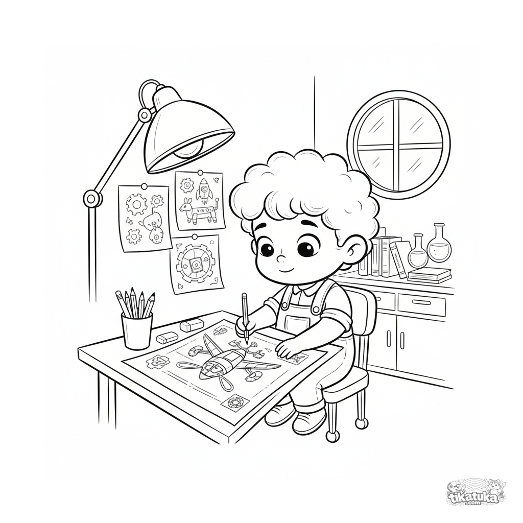 Раскраска для детей 7-9 лет: мальчик в лаборатории за кульманом увлечённо рисует детальный чертёж летательного аппарата. Сцена для творчества.