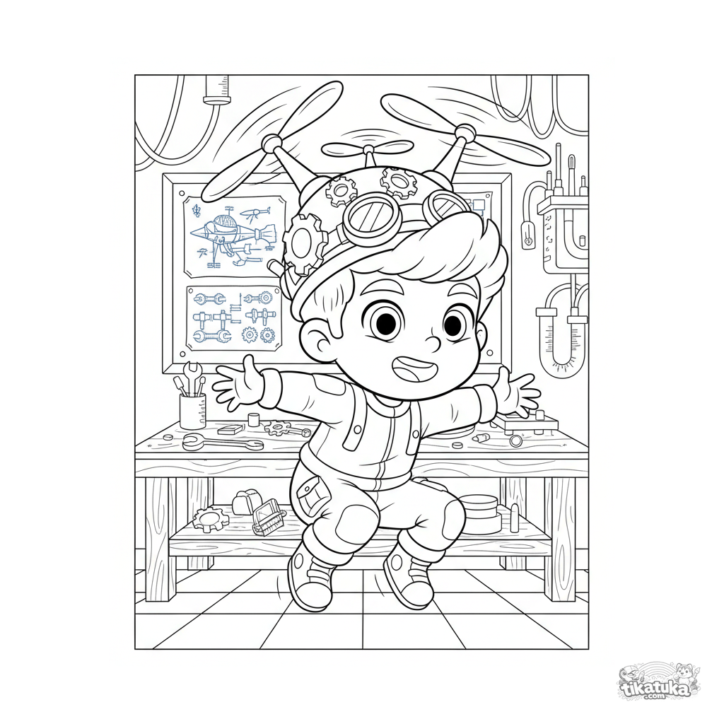 Раскраска для детей 7-9 лет: мальчик в секретной лаборатории тестирует своё изобретение — шляпу с пропеллерами, которая позволяет летать. Динамичная сцена.