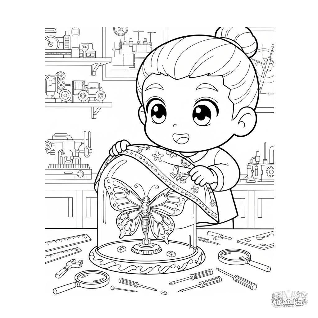 Раскраска для детей 7-9 лет: мальчик в лаборатории снимает покрывало с витрины, демонстрируя хрупкую механическую бабочку с медными крыльями.