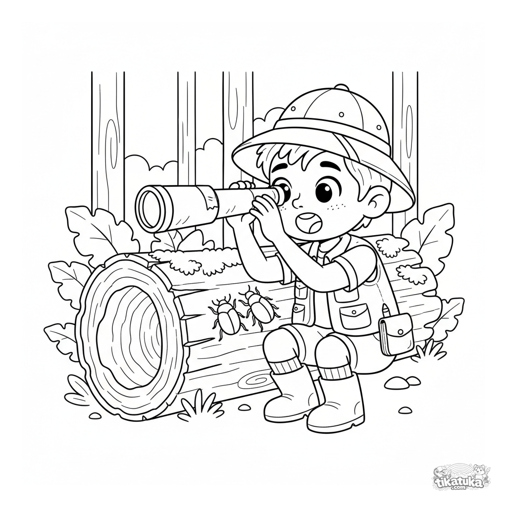 Раскраска для мальчиков 4-6 лет: юный исследователь в шляпе с самодельным перископом заглядывает внутрь огромного пустого пня в лесу.