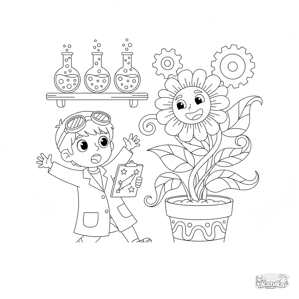 Раскраска для мальчиков 4-6 лет: удивленный юный ученый в секретной лаборатории наблюдает за говорящим растением с дружелюбным лицом.