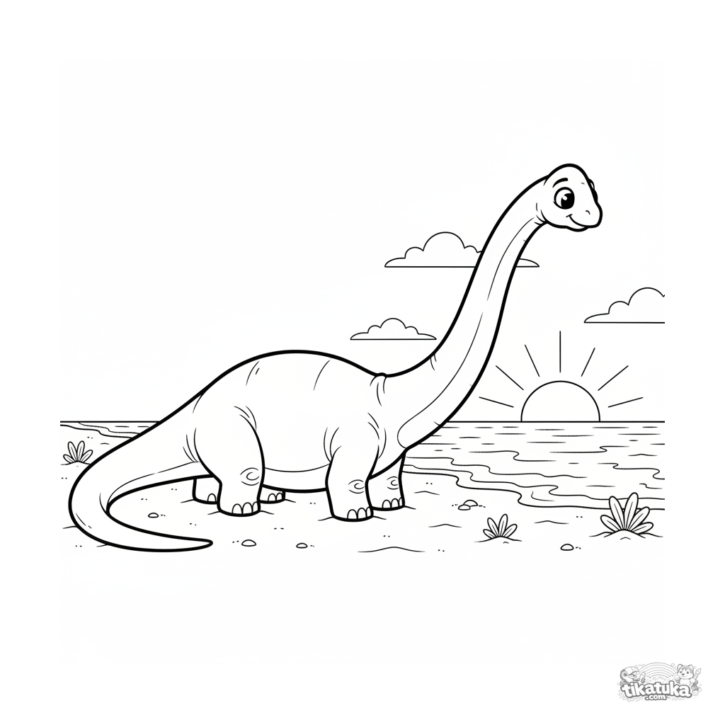 Раскраска для детей 7-9 лет: брахиозавр в стиле акварельного скетча мирно отдыхает на песке пляжа древнего океана на закате. Спокойная сцена.