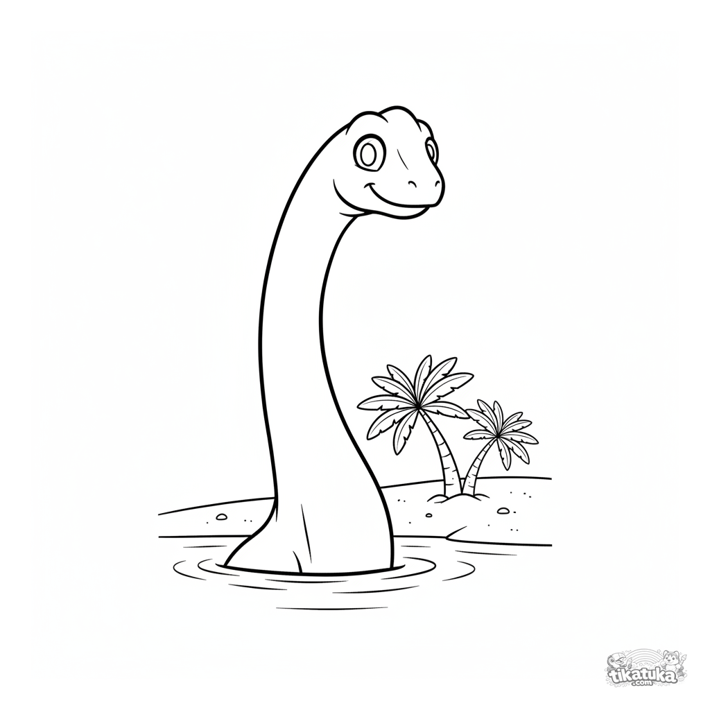 Раскраска для детей 7-9 лет: брахиозавр заходит в воду древнего океана, видна только его длинная шея и голова. Элегантный мультяшный стиль.