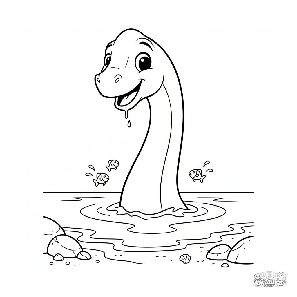 Раскраска для детей 7-9 лет: брахиозавр высовывает свою длинную шею из воды древнего океана у песчаного берега. Любопытное и доброе выражение лица.