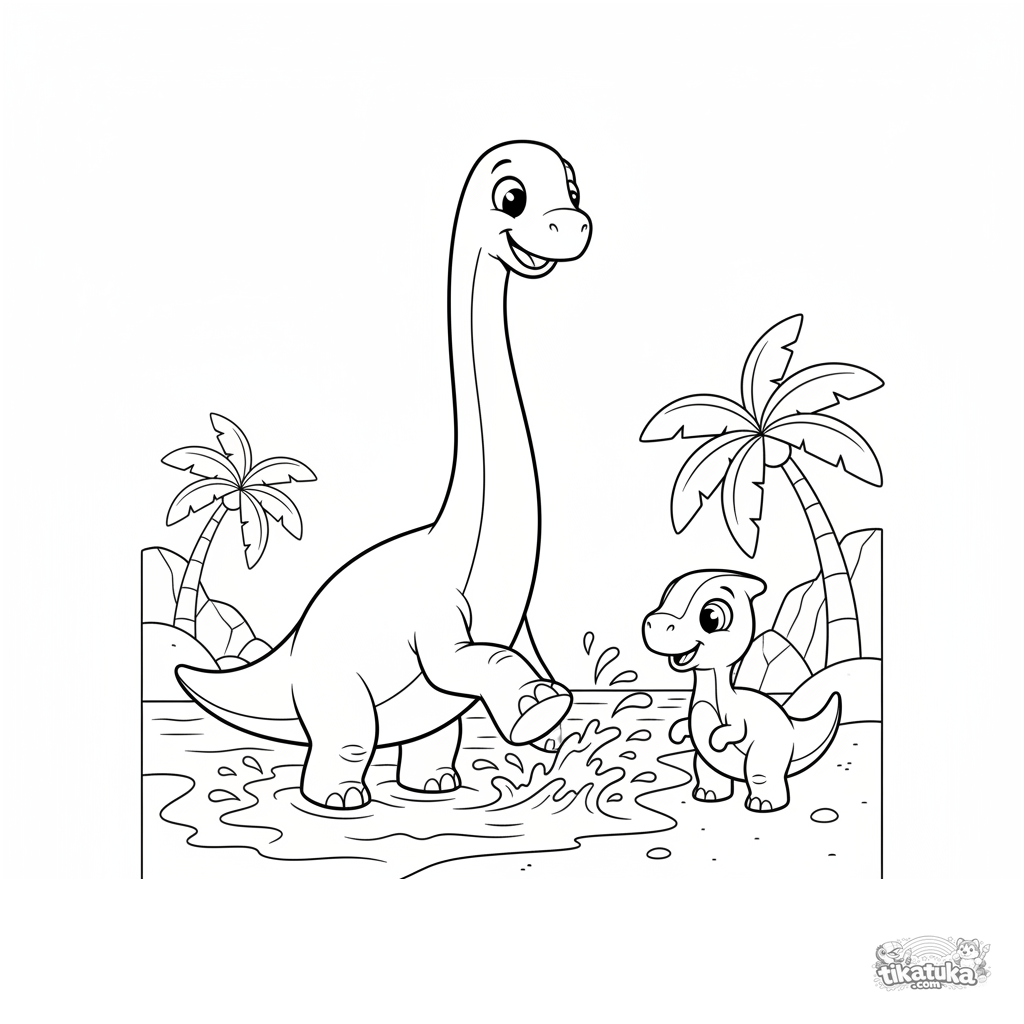 Раскраска для детей 7-9 лет: молодой брахиозавр весело плещется у кромки воды древнего океана, играя с другом-динозавром. Выразительные позы, умеренная детализация.