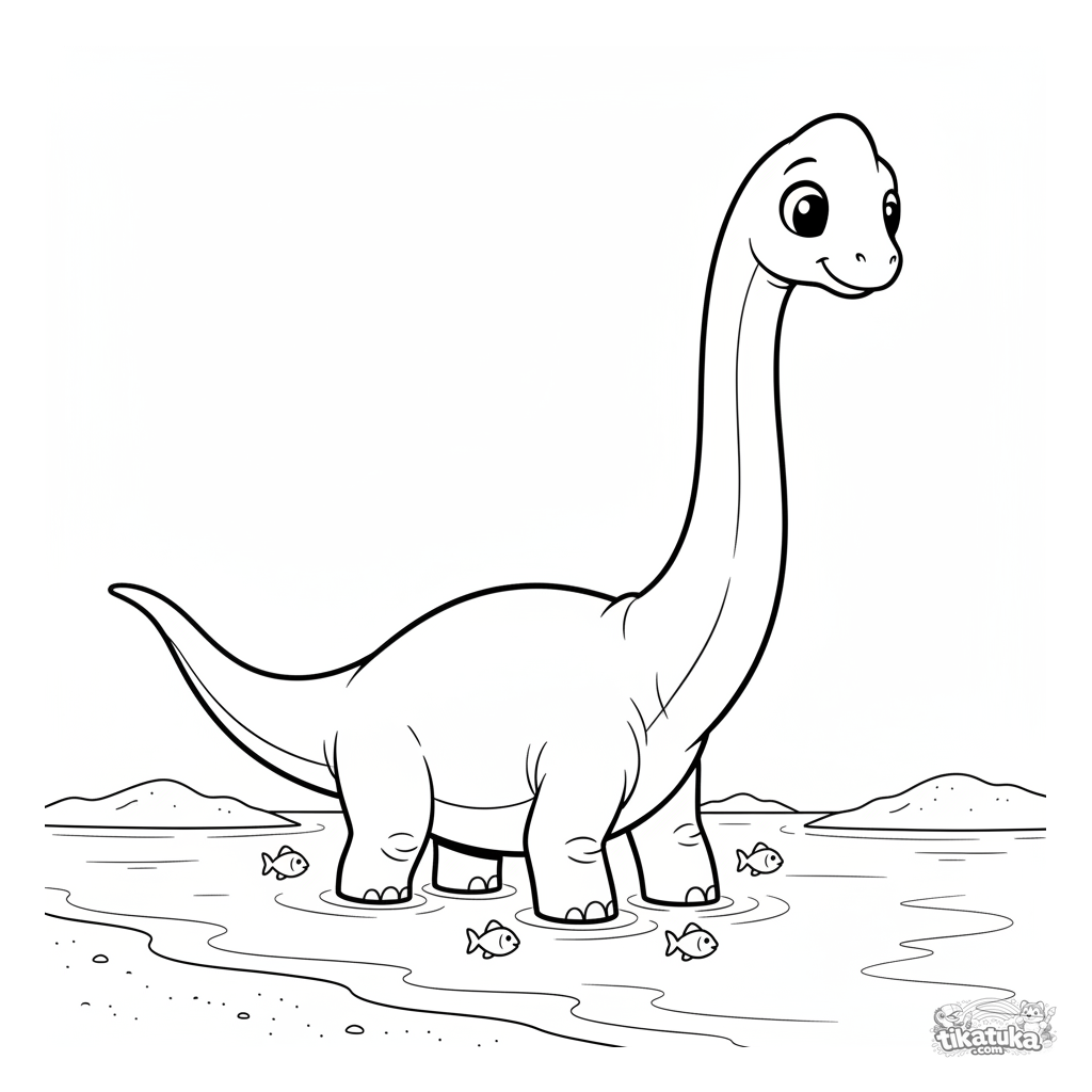 Раскраска для детей 7-9 лет: огромный брахиозавр медленно идёт по мелководью древнего океана у песчаного пляжа. Рыбки плавают вокруг, сцена в стиле скетча.