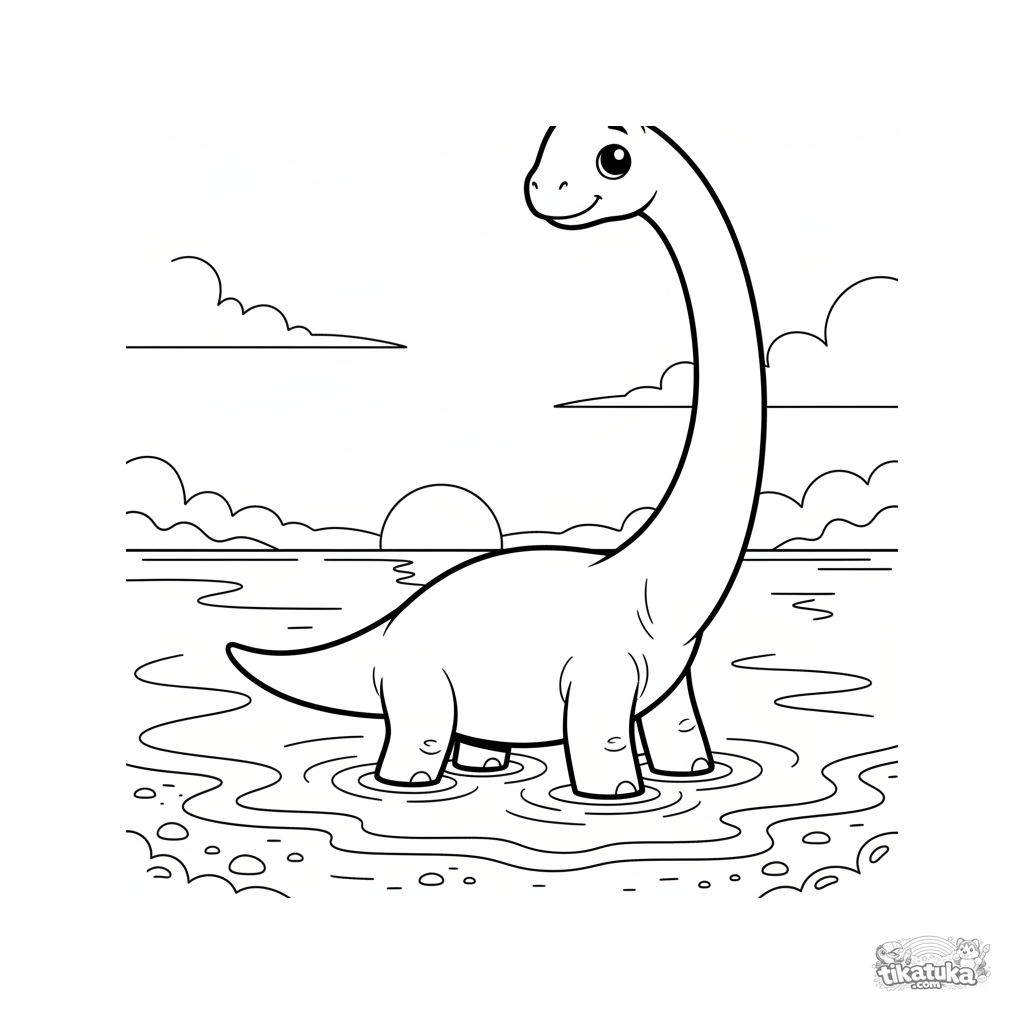 Раскраска для детей 7-9 лет: величественный брахиозавр бредет по спокойной воде древнего океана на фоне заката. Длинные плавные линии, атмосферная сцена, умеренная детализация.