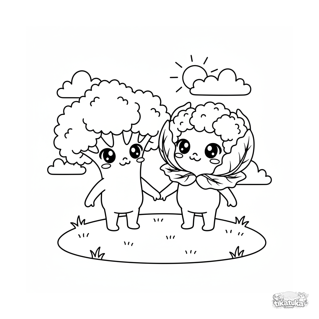 Раскраска с милыми чиби-персонажами: брокколи и цветная капуста держатся за руки. Для детей 4-6 лет. Яркие глаза, простые формы, тема дружбы.