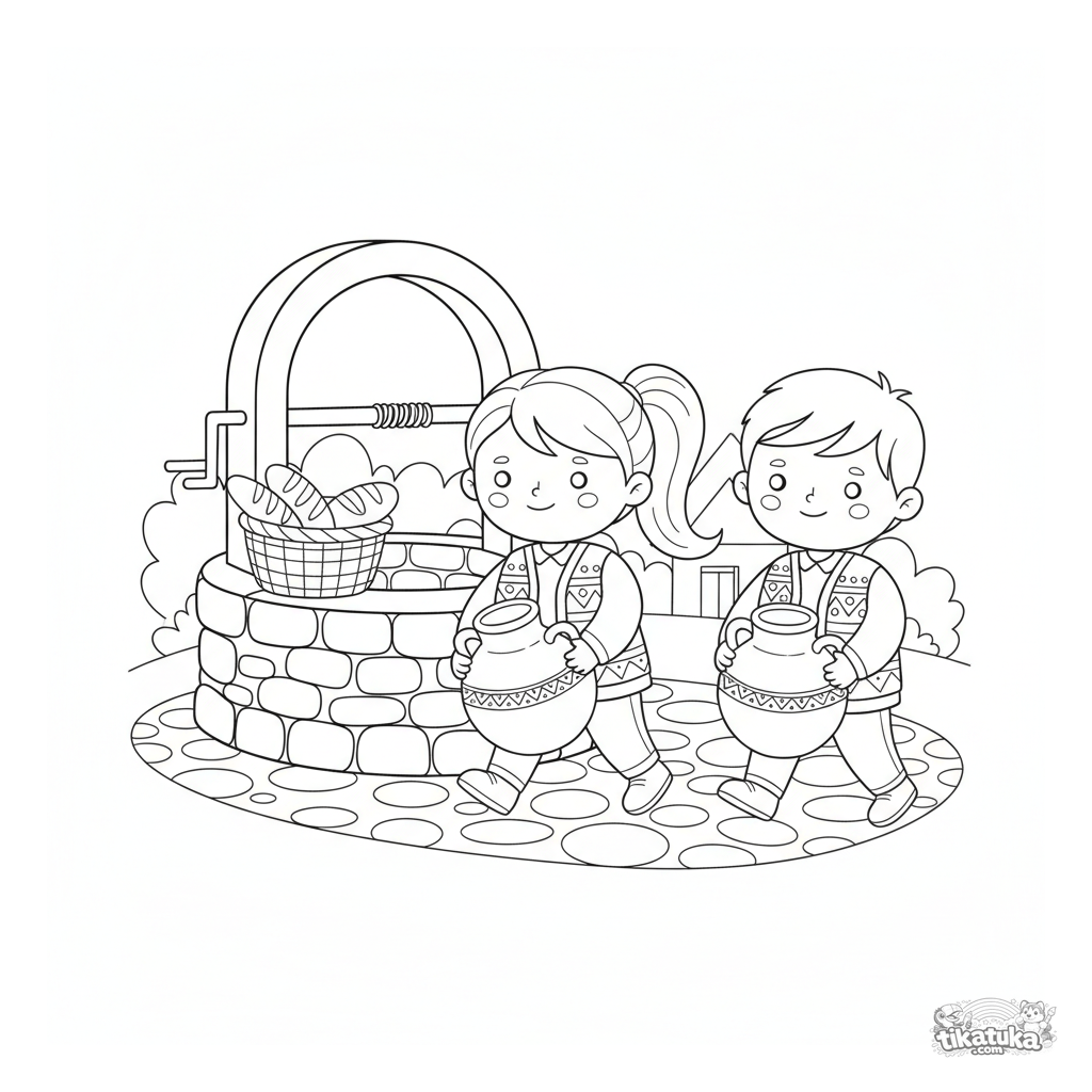 Раскраска для детей 4-6 лет: брат и сестра в народных жилетах несут кувшины с водой от колодца. Сцена в стиле деревянной игрушки, простая и добрая.