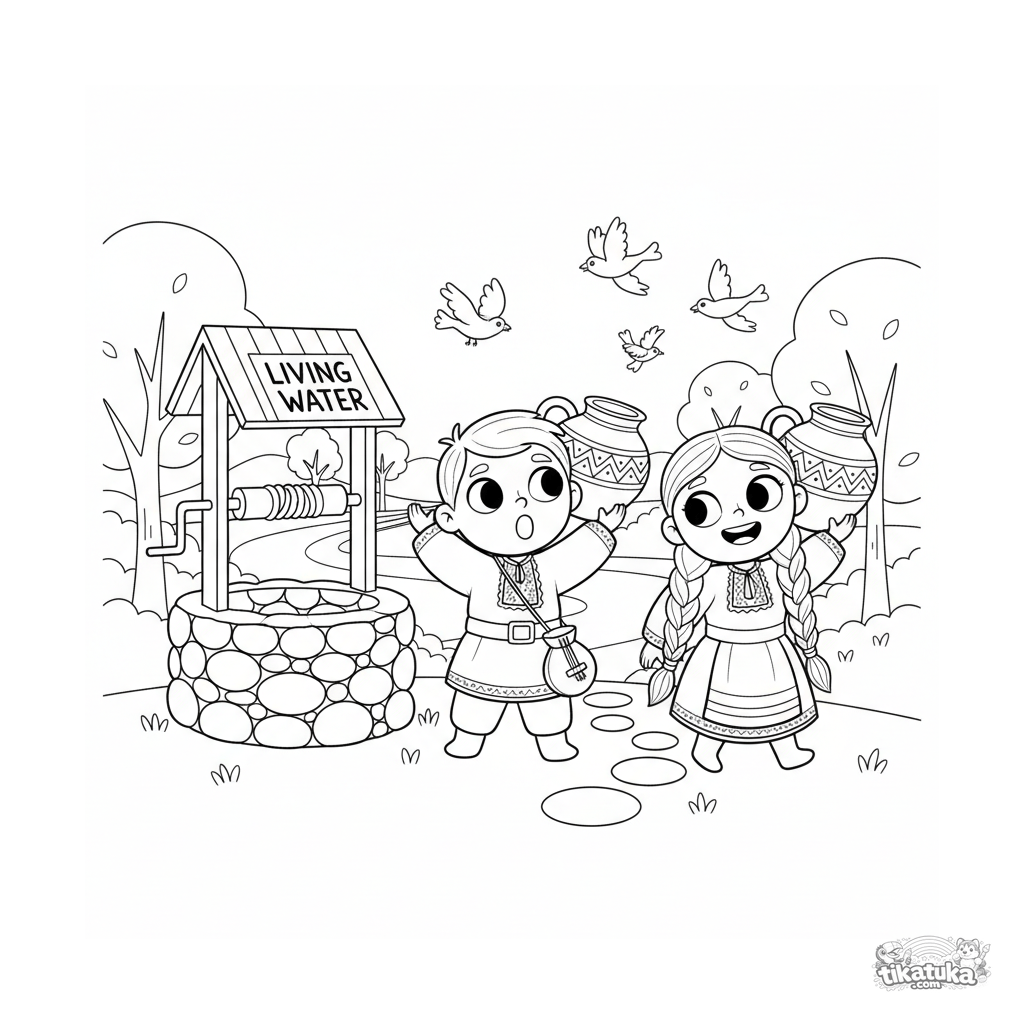 Раскраска для детей 7-9 лет: брат и сестра в народных костюмах несут воду от колодца. Динамичная сцена с умеренной детализацией.