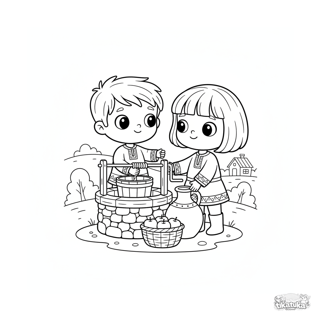 Раскраска для детей 7-9 лет: брат с сестрой дружно набирают воду из волшебного колодца. Тёплая сцена сотрудничества в народном стиле.