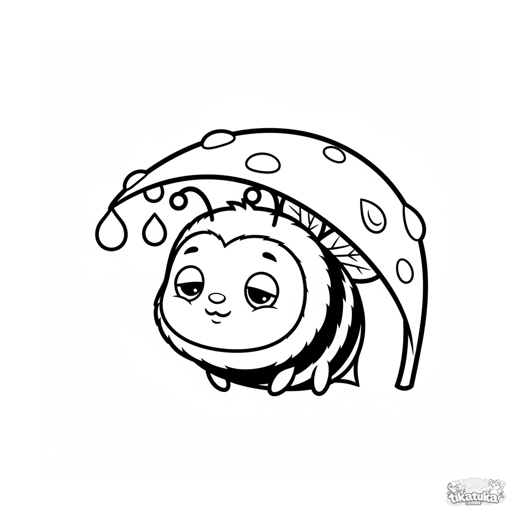 Раскраска для малышей: пушистый шмель прячется под большим листом с каплями росы. Крупные простые формы, плюшевый мультяшный стиль.