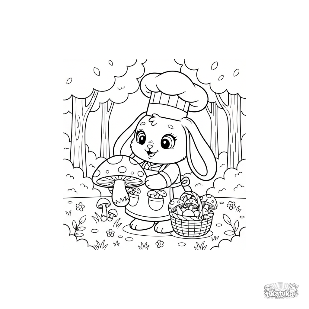 Раскраска для детей 4-6 лет: милый кролик-пекарь в лесу собирает грибы. Простые линии, скандинавский стиль плюшевой игрушки, широкие поля для раскрашивания.