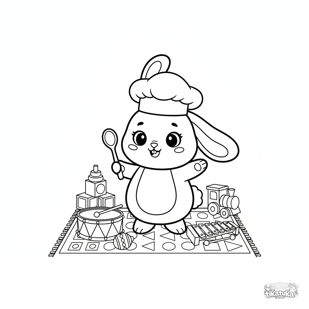 Раскраска для детей 4-6 лет: кролик-пекарь дирижирует игрушечным оркестром. Стиль плюшевого маскота, простые формы инструментов, широкие чистые поля для раскрашивания.