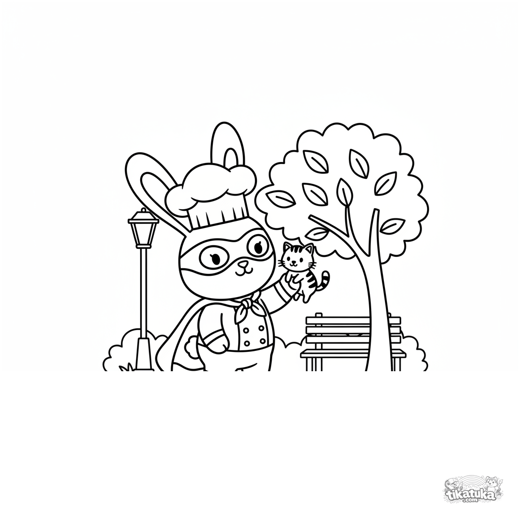 Раскраска для детей 4-6 лет: супергерой кролик-пекарь в маске и плаще спасает котёнка, застрявшего на дереве в парке. Геометричные формы в стиле деревянной игрушки.